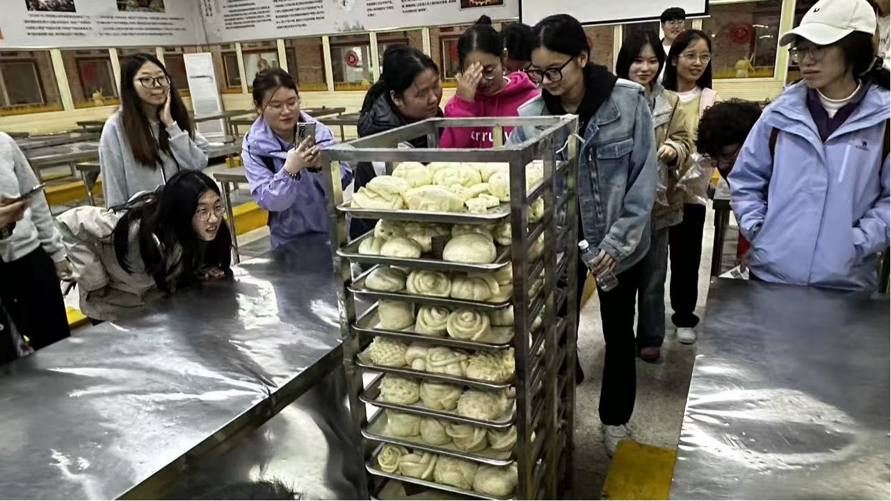 随后,同学们来到二月二农场,参观并学习了青岛市级非物质文化遗产项目——王哥庄大馒头的制作技艺。农场讲解员为大家介绍了大馒头的历史渊源及发酵工艺流程,同学们还亲身参与了揉面、塑形、蒸制等环节,体验传统技艺的魅力。在实践中,同学们不仅感受到了非遗文化的温度,也更加理解了传统美食中蕴含的匠心与智慧。